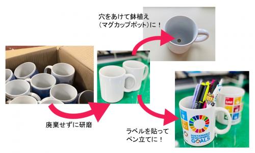 他にも制作過程で不備のでたマグカップのプリント部分を研磨し、底に穴を開けて、小さな植木鉢として無償で提供しています。また、ペン立等にもアップサイクルできます。廃棄処分していたものに、新たな役割を持たせて有効活用することもSDGsに繋がるとの思いから取り組んでおります。これからも大きな事はできませんが、我々ができる持続可能な取組を続けて行きます。